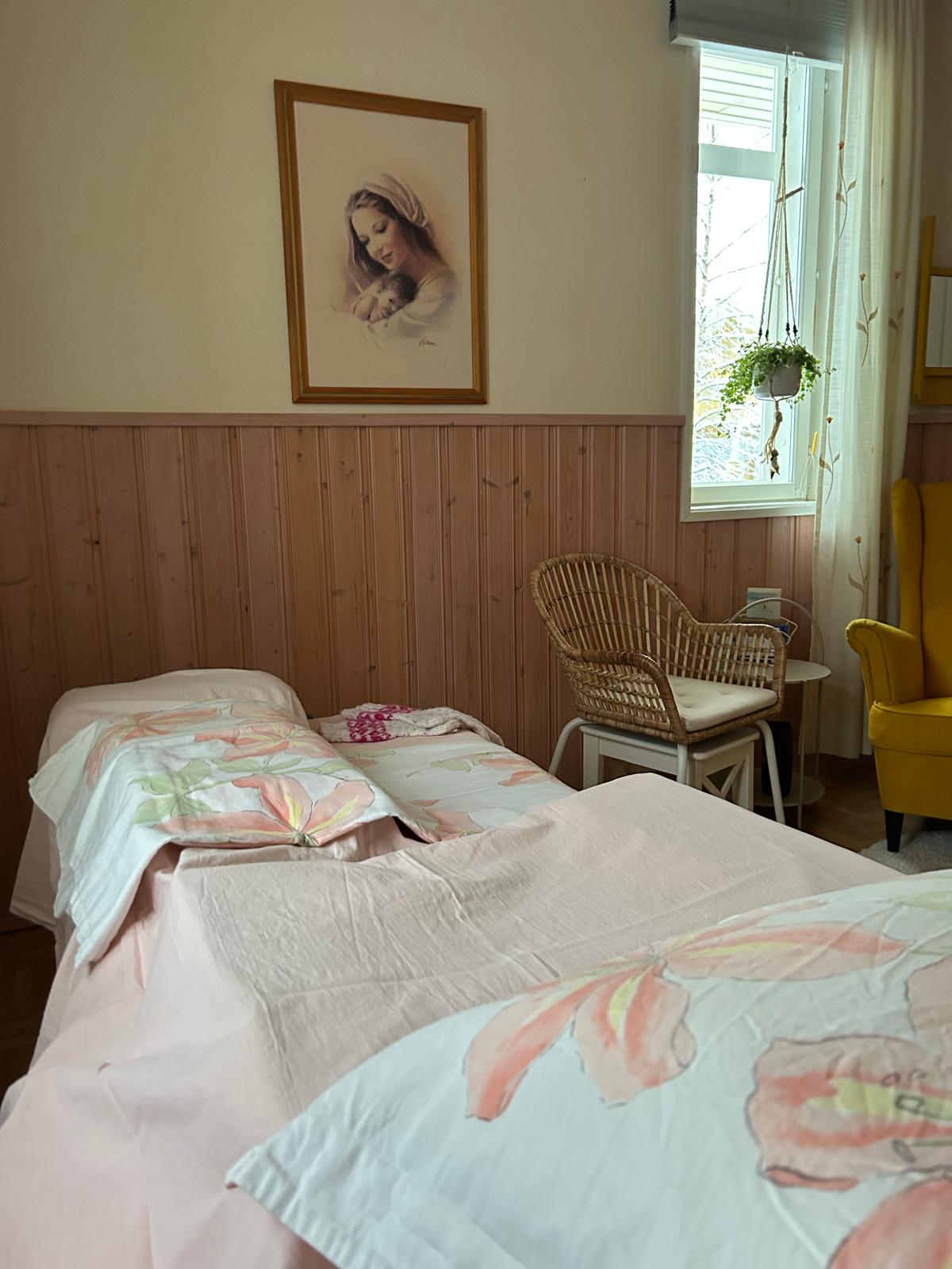 Hoito tehdään rv huomioiden kyljen kautta, puoli-istuvassa tai perinteisessä hieronta-asennossa hoitopöydällä. Kuinka äiti haluaa.